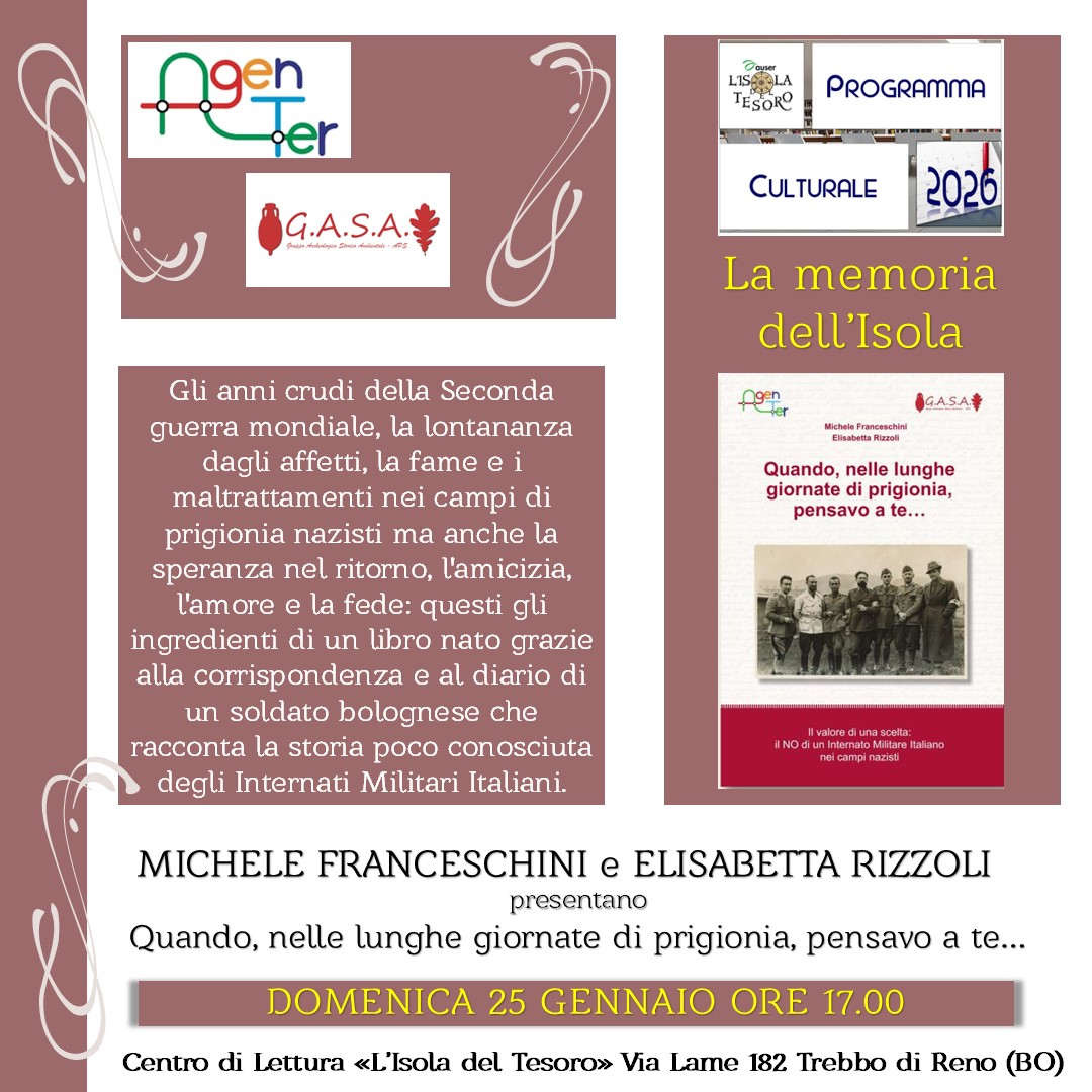 Vi aspettiamo per un incontro con Michele Franceschini ed Elisabetta Rizzoli, autori del libro “Quando nelle lunghe giornate di prigionia pensavo a te…” che ripercorre, attraverso il diario e le lettere del medico bolognese Armando Franceschini, l’esperienza dolorosa della prigionia nei campi nazisti degli Internati Militari Italiani: uomini che hanno resistito, sofferto e custodito la propria umanità anche nei momenti più bui.